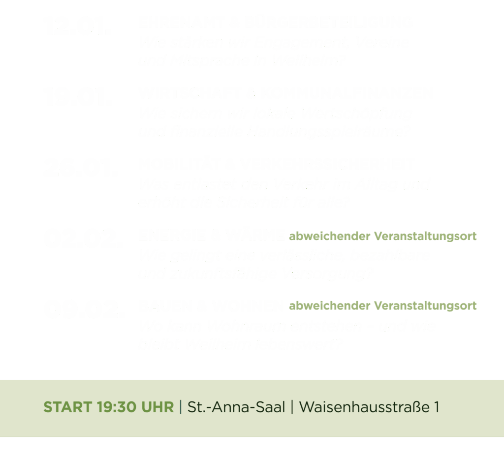 Was bewegt Weilheim heute? Wo läuft es gut – und wo braucht es neue Ideen? Wie gestalten wir unsere Stadt gemeinsam weiter? In einer Reihe von offenen Themenforen sprechen wir über zentrale Fragen unserer Stadt – sachlich, respektvoll und auf Augenhöhe. Seien Sie dabei!